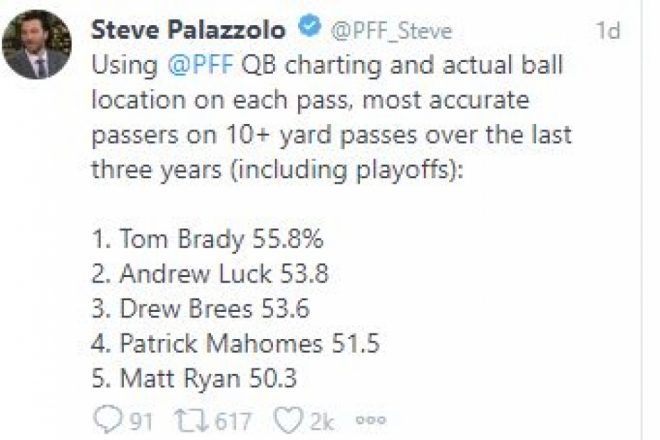 Pro Football Focus (PFF) Steve Palazzolo put out some startling stats on Friday which got social media aflame, especially those who consider Tom Brady a “dink and dunk” QB. According to the stats that Palazzolo posted, not only did Brady have the best percentage of passes completed of 10+ yards downfield, he attempted the most in the past three seasons.