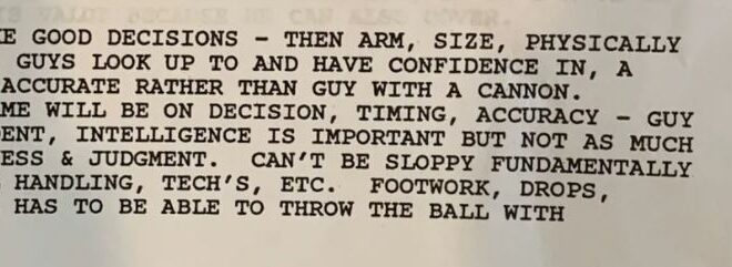At first glance, it looks like Belichick wrote this about Tom Brady, but when you think about the fact that Belichick wrote this about a decade before they drafted Brady, it explains why he had so much success in the Patriots’ system.
