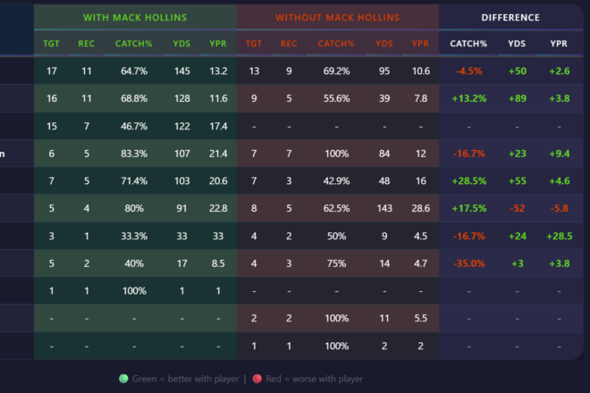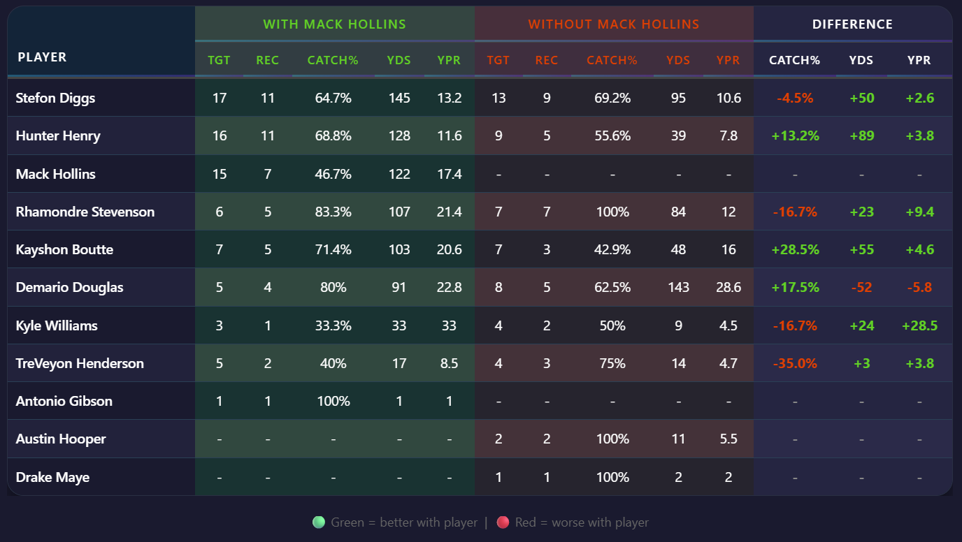 Kayshon Boutte, Demario Douglas, and Hunter Henry – Drake Maye’s favorite targets on third down this season – have all seen an increase both in their catch % and yards per reception when Hollins is out there. The latter stat is thanks to how good Hollins is at blocking, which has created opportunities for his teammates to pick up additional yards after the catch.